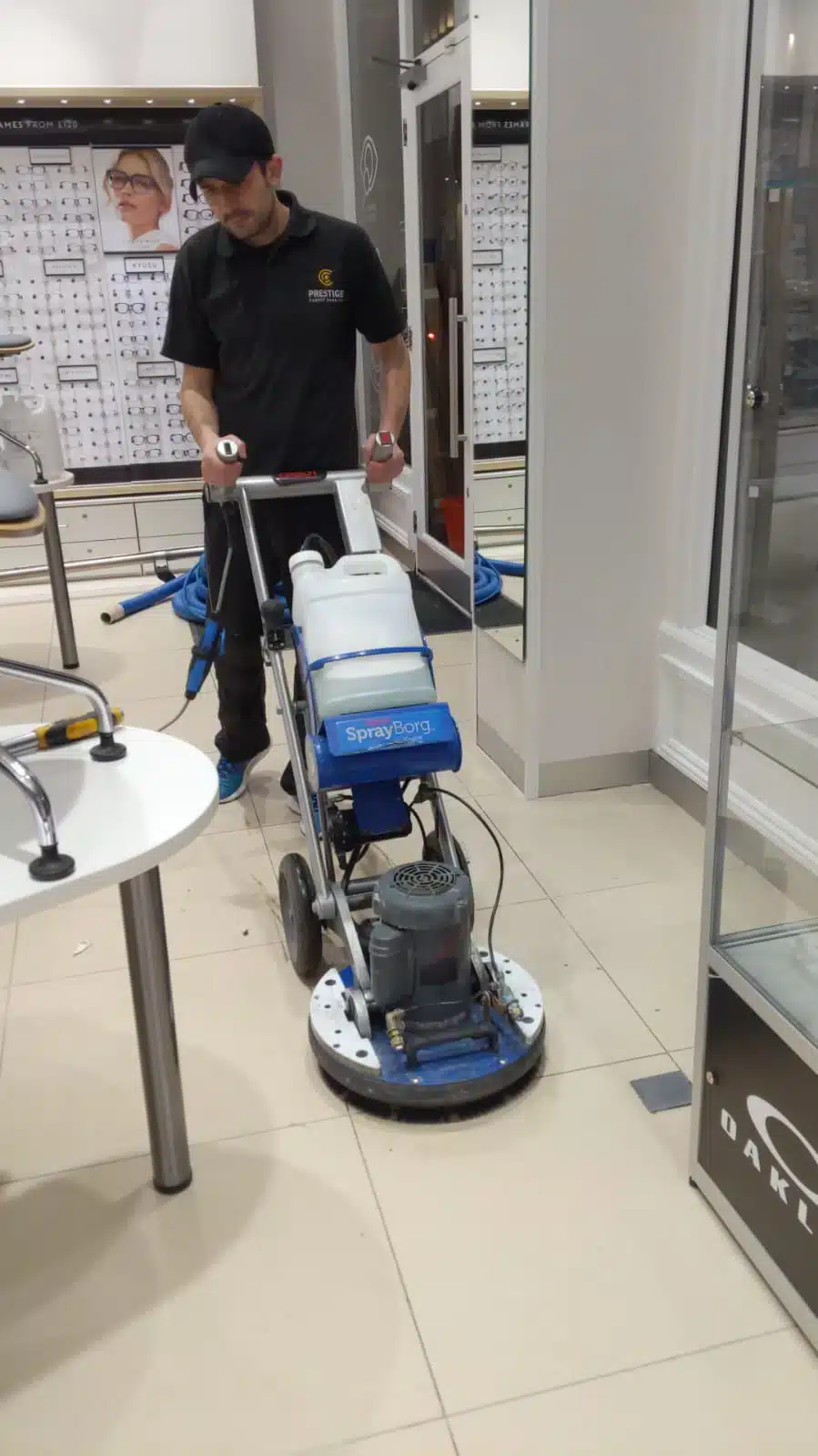Prestige provides a comprehensive floor maintenance solution for Boots Opticians at London Wall. This retail environment requires a dual-technical approach, managing both heavy-traffic commercial carpeting and high-spec tile and grout surfaces to maintain the clinical standards expected of a leading healthcare provider.